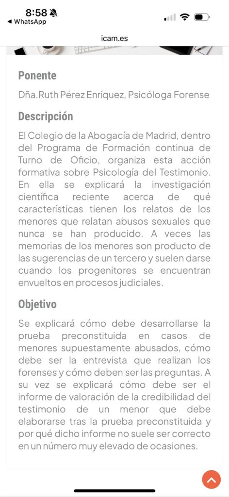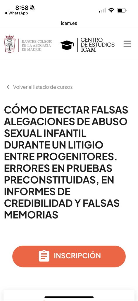 Hacemos constar que, aunque se haya modificado recientemente el nombre de la jornada formativa a «Psicología del testimonio en menores, informe de expertos y determinación de la verdad por el órgano judicial: problemas prácticos», no ha cambiado la formadora responsable. Esta profesional ha impartido anteriormente formaciones en las que se promueven estas narrativas, como la titulada «Falsas memorias en abuso sexual infantil: ¿mito o realidad?«. La permanencia de la misma profesional invalida la jornada en su conjunto, puesto que garantiza la reproducción de un enfoque sesgado e incompatible con la normativa nacional e internacional de protección de la infancia y de las mujeres.